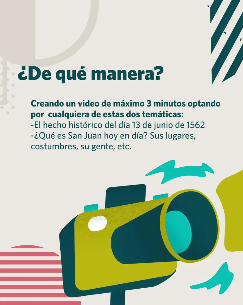Organizado por la Dirección de Educación, Empleo y Juventud, este concurso invita a los jóvenes sanjuaninos de hasta 20 años a expresar su visión de la historia y el presente de San Juan a través de cortometrajes de hasta tres minutos de duración. La convocatoria se enfoca en dos temáticas principales: