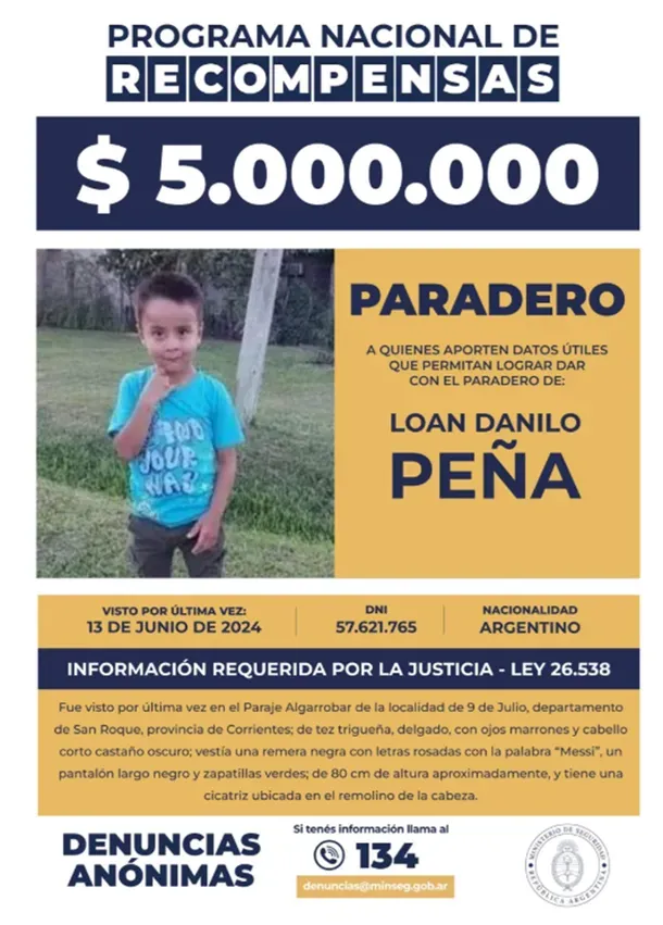 "Ofrézcase como recompensa, dentro del territorio de la República Argentina, la suma de Pesos Cinco Millones ($5.000.000), destinada a aquellas personas que, sin haber intervenido en los hechos delictuales, brinden datos útiles que permitan lograr dar con el paradero del menor de edad Loan Danilo Peña", señala la resolución.