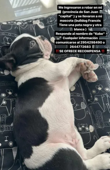 El jugador, a través de las redes sociales, pidió ayuda para encontrar a su perro. "Me ingresaron a robar a mi casa en Capital y se llevaron a mi mascota, un bulldog francés. Tiene una pata negra y otra blanca, responde al nombre de Kobe", escribió