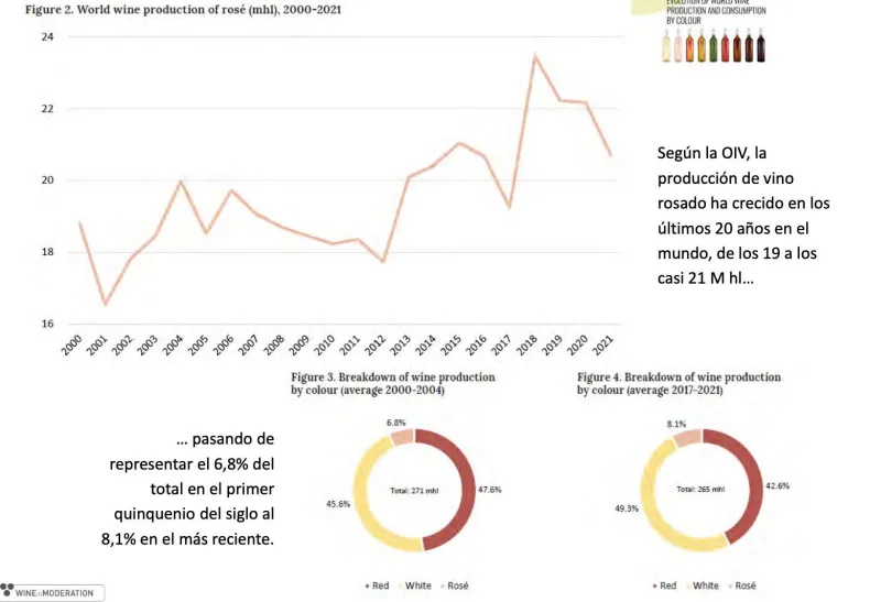 El vino rosado ha sido uno de los segmentos que más ha crecido en las últimas dos décadas. Según datos de la Organización Internacional de la Viña y el Vino (OIV), la producción mundial de vino rosado ha aumentado de 19 a casi 21 millones de hectolitros, pasando de representar el 6.8% del total en el primer quinquenio del siglo al 8.1% en el más reciente.
