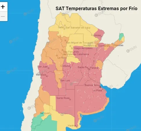 Para este viernes 12 de julio rige en San Juan un Alerta roja por frío extremo en San Juan. Este día amaneció con una temperatura mínima que superó los cinco grados bajo cero. El Servicio Meteorológico Nacional (SMN) preveía para esta jornada una mínima de -3 °C, pero la temperatura registrada fue de -5.6°C, con una sensación térmica de -8.3 °C.