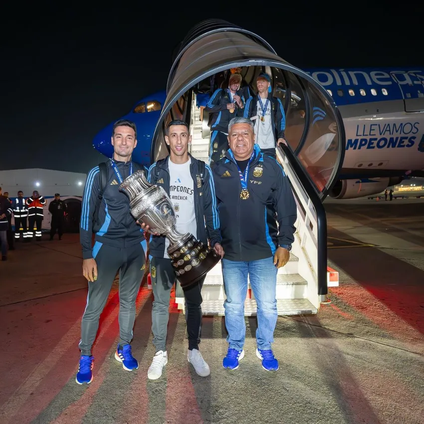La Selección Argentina volvió al país este lunes por la noche luego de consagrarse bicampeona de la Copa América en Estados Unidos. Sin la presencia de Lionel Messi, el encargado de encabezar el equipo, además del DT Lionel Scaloni, fue Ángel Di María, quien bajó del avión con la copa entre sus brazos.