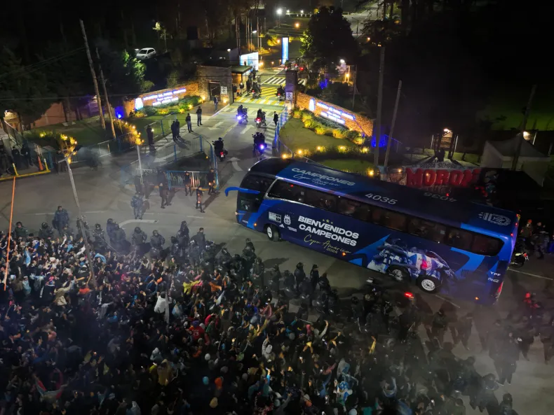 Más de 3.000 simpatizantes del elenco nacional se acercaron hasta el predio que la AFA posee en la localidad bonaerense de Ezeiza para esperar la llegada de los bicampeones con gritos de aliento y fuegos artificiales para recibir al plantel.