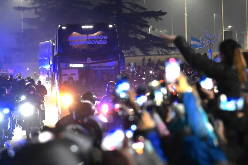 Como luego de aquel recibimiento en 2022, cuando la Argentina se consagró campeona del mundo en Qatar, venciendo a Francia en los penales, un gran grupo de hinchas se acercaron para recibir a los bicampeones con gritos y alientos de felicidad.