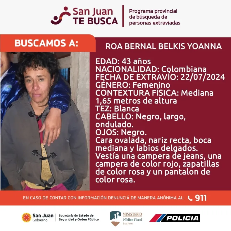 En las últimas horas, desde San Juan Te Busca, se informó que se activó el protocolo por una mujer de nacionalidad colombiana. Se trata de Belkis Yoanna Roa Bernal quien desapareció y su familia no tiene información sobre su paradero, por lo que acudieron a la Policía.