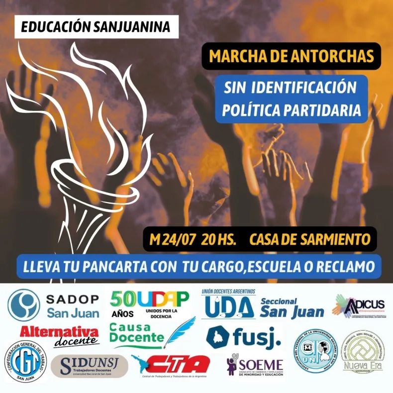 De ahí que los gremios agrupados, invitan a todos los profesionales y trabajadores de la Educación Sanjuanina a participar de la Marcha de Antorchas, prevista para este miércoles 24 de julio, desde las 20 hs. en Casa de Sarmiento, sin tener en cuenta identificación Política Partidaria. La idea es llegar con pancartas con tu cargo, escuela o reclamo.