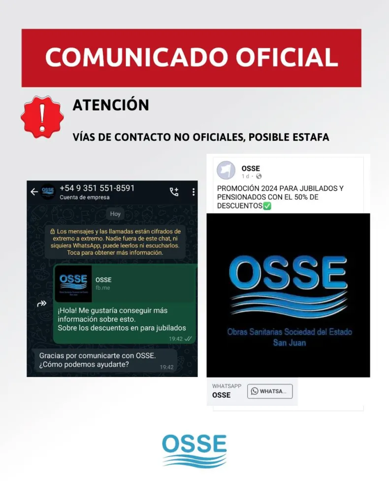 En las últimas horas, OSSE advirtió a la población sobre estafas por WhatsApp a nombre del organismo.
