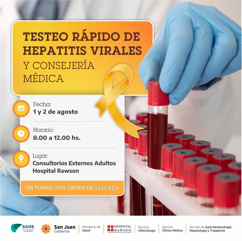 El Hospital Dr. Guillermo Rawson llevará a cabo una importante campaña de detección de hepatitis virales, ofreciendo testeo rápido y gratuito a la comunidad. La actividad se realizará el jueves 1 y viernes 2 de agosto, de 8:00 a 12:00 horas, en los Consultorios Externos de Adultos del hospital.