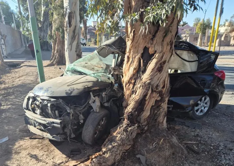 Un impactante accidente ocurrió en la siesta de hoy en Rivadavia. Un vehículo marca Nissan Tida dominio HYJ417 impactó de lleno contra un árbol en calle Hipolito Yrigoyen a la altura de la numeración 1433 sur.
