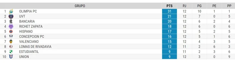 El escolta de Olimpia en la tabla es UVT, que venció a domicilio a Hispano 5 a 2 con los goles de Felipe Jurado, Víctor Núñez, Facundo Peralta y dos de Roberto Aciar. Para los locales anotó Mario Rodríguez.