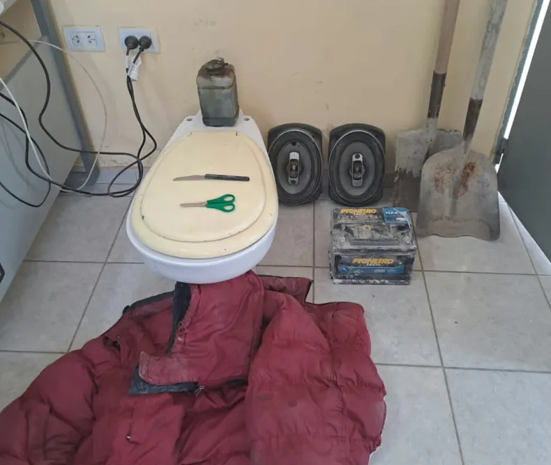 Así fue que los uniformados, una vez en el lugar, visualizaron al sujeto con las características aportadas y efectivamente llevaba consigo un inodoro de cerámica blanco con su tapa correspondiente, dos palas, una batería de automóvil y dentro de una bola transportaba dos parlantes de vehículo, informaron desde la Policía.