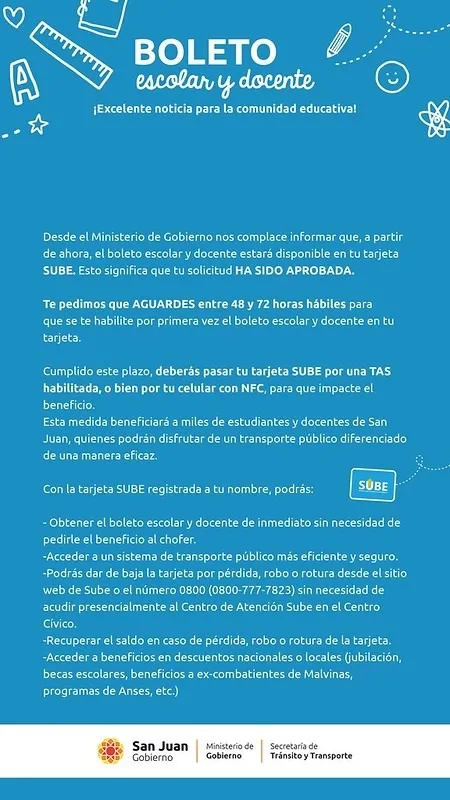 El Ministerio de Gobierno, a través de la Secretaría de Tránsito y Transporte informa que, a partir de este martes 13 de agosto, comenzará el proceso de activación del beneficio del Boleto Escolar y Docente en la Tarjeta Sube.