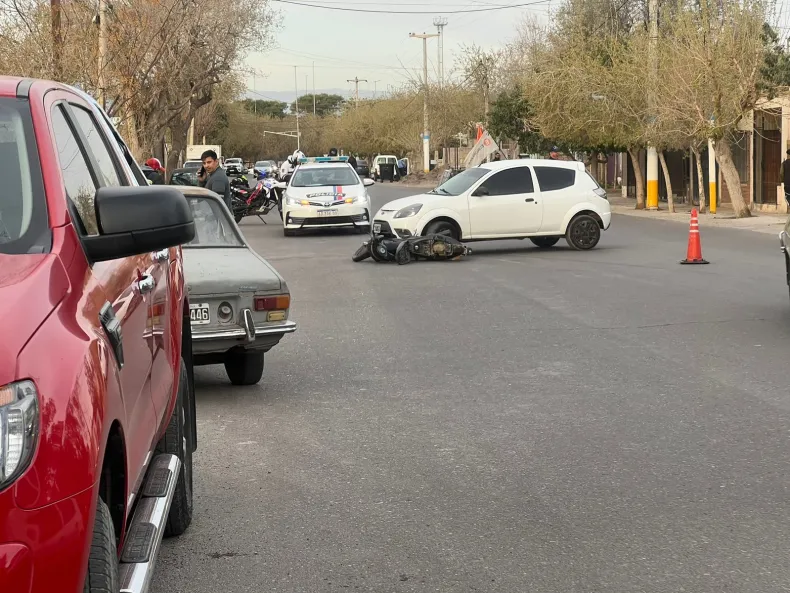 En la tarde de este jueves, se registró un accidente vial en la localidad de Desamparados, San Juan. El siniestro involucró a un automóvil Ford Ka de color blanco y una motocicleta de 110 cc de color negra.