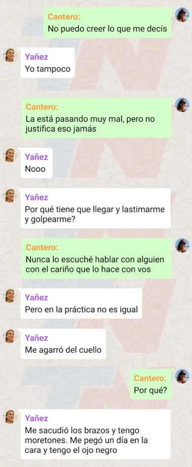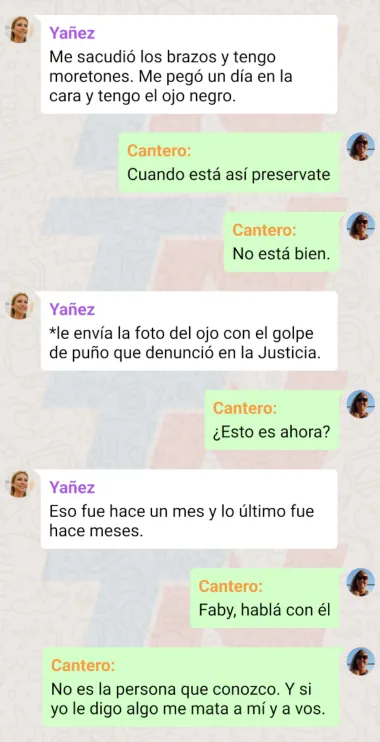 En otra parte de la conversación, Cantero se muestra sorprendida por la situación que enfrenta Yañez, comentando que Fernández "no es la persona" que ella conocía y que estaba impactada por los hechos de violencia que se le atribuyen. Cantero también expresa su preocupación por las posibles consecuencias de hablar abiertamente sobre el tema: "Si yo le digo algo, me mata a mí y a vos".