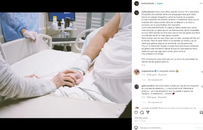 "Hace mucho que no saco fotos que no sean pavadas del día con el celular. Para mí sacar fotos no es apretar un botón y ya, se tiene que generar algo en el ambiente, con las personas. Hoy, en la habitación donde mi papá lleva dos meses internado, se generó ese momento, ese en el que los que sacamos fotos sabemos que hay algo para contar, para mostrar. Hoy entendí a mi amiga. P.D.: obviamente subo solo esta por un tema de privacidad, las demás me las guardo para mí", finaliza la hija de Lanata.