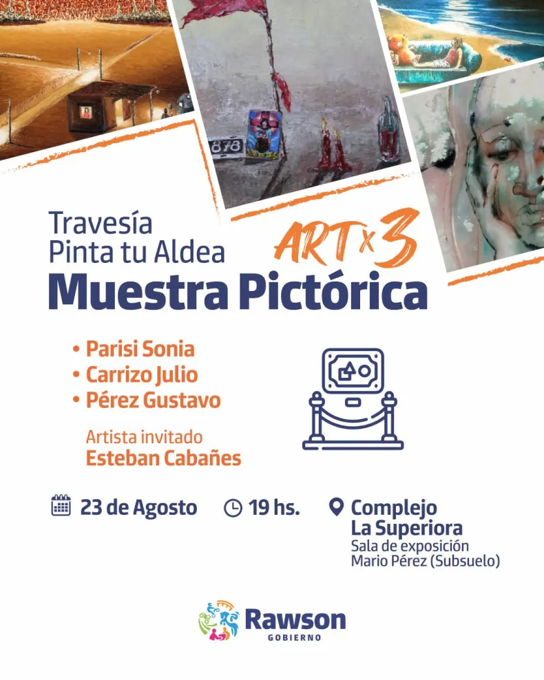 Bajo el lema "Travesía: Pinta tu Aldea - ART x 3", la Municipalidad de Rawson, invitan para hoy, a partir de las 19.00, a la inauguración de dicha la muestra pictórica, que se llevará a cabo en la Sala de Exposición Mario Pérez, ubicada en el subsuelo del Complejo La Superiora.