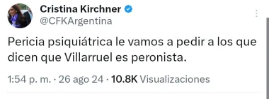 "Pericia psiquiátrica le vamos a pedir a los que dicen que Villarruel es peronista", fue el mensaje que escribió la ex presidente y vicepresidente de la Nación.