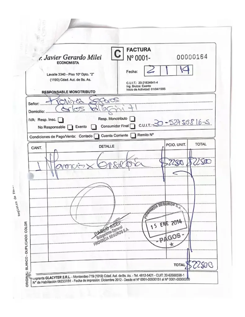 Durante el período 2012-2015, Milei emitió facturas a favor de Provincia Seguros por un total actualizado a agosto de este año de 120.4 millones de pesos, según los cálculos del IPC. Estos documentos, al parecer, no correspondían a servicios efectivamente realizados, y tampoco existen registros de que Milei haya visitado alguna vez la sede de la compañía en Buenos Aires.