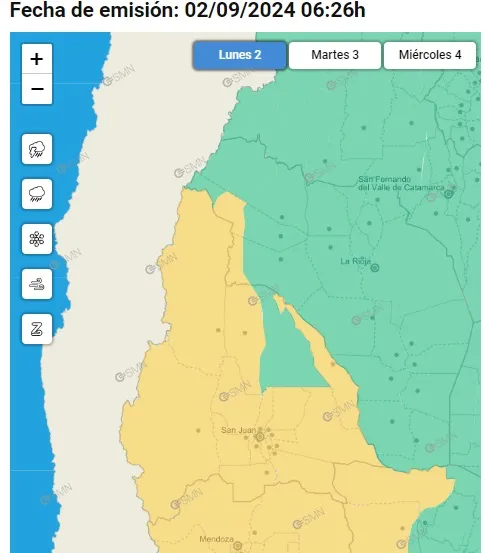 El Servicio Meteorológico Nacional emitió una alerta amarilla para San Juan debido a la llegada del viento Zonda este lunes. Se espera que el viento del noroeste sea constante a lo largo del día, con ráfagas que podrían superar los 60 km/h durante la tarde.