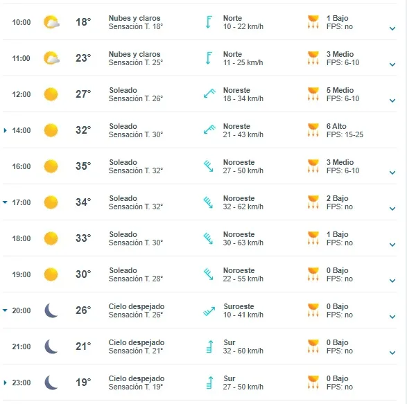 Según el sitio especializado Meteored, las ráfagas comenzarán alrededor de las 14:00 horas con una velocidad de entre 21 y 41 km/h. Para las 17:00 horas, se espera una mayor velocidad, con ráfagas que podrían alcanzar entre 32 y 62 km/h. La temperatura máxima prevista para esta jornada es de 34 grados.