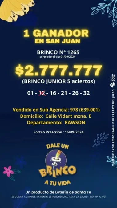 Una vez más, un sanjuanino se convirtió en el ganador del premio mayor del "Brinco Junior" durante el sorteo N° 1265. Los números ganadores fueron 01, 16, 21, 26 y 32.