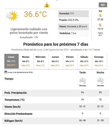 El Servicio Meteorológico Nacional emitió una alerta amarilla para la provincia de San Juan debido a las fuertes ráfagas del Viento Zonda. Esta alerta se mantiene activa durante la tarde de este lunes, y se recomienda a la población tomar precauciones.