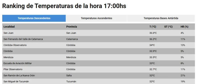 En el ranking de temperaturas del Servicio Meteorológico Nacional a las 17 horas, San Juan se posiciona como la provincia más caliente del país, seguida por San Fernando del Valle de Catamarca, Córdoba (Observatorio), Mendoza y otras localidades cordobesas.