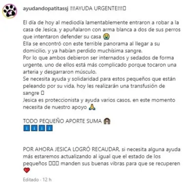 Los perros, al enfrentar a los asaltantes, fueron atacados con un arma blanca, resultando en graves heridas y una pérdida significativa de sangre. Cuando Jesica llegó a su hogar, se encontró con una escena devastadora: sus mascotas se encontraban heridos y en estado crítico.