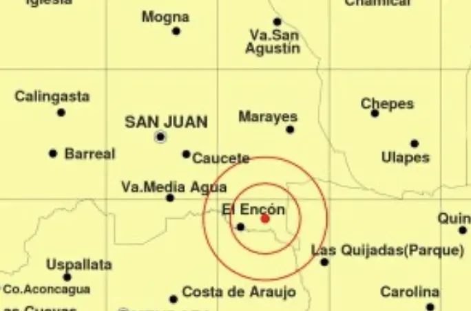 El movimiento telúrico ocurrió a las 00:08:29 horas y tuvo su epicentro a 20 kilómetros al este de El Encón, a 62 kilómetros al sur de Bermejo, y a 63 kilómetros al noroeste del Parque Nacional Sierra de las Quijadas, en San Luis.