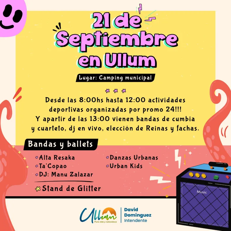 Con las actuaciones de las bandas Alta Resaka y Ta"Copao y la participación del DJ Manu Zalazar, que estará a cargo de toda la música, el próximo sábado 21, la Municipalidad de Ullum, ha organizado en el Camping Municipal los festejos de la "Primavera", a partir de las 8 de la mañana.