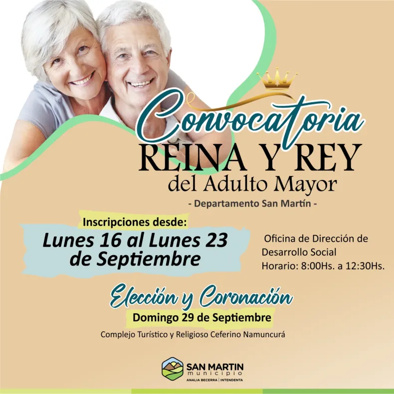 Desde este lunes 16 y hasta las 23, la dirección de Desarrollo Social de la Municipalidad de  San Martín, invita a todos los abuelos del departamento a participar de la celebración por la llegada de la "Primavera", donde se elegirá a la Reina y al Rey del Adulto Mayor.