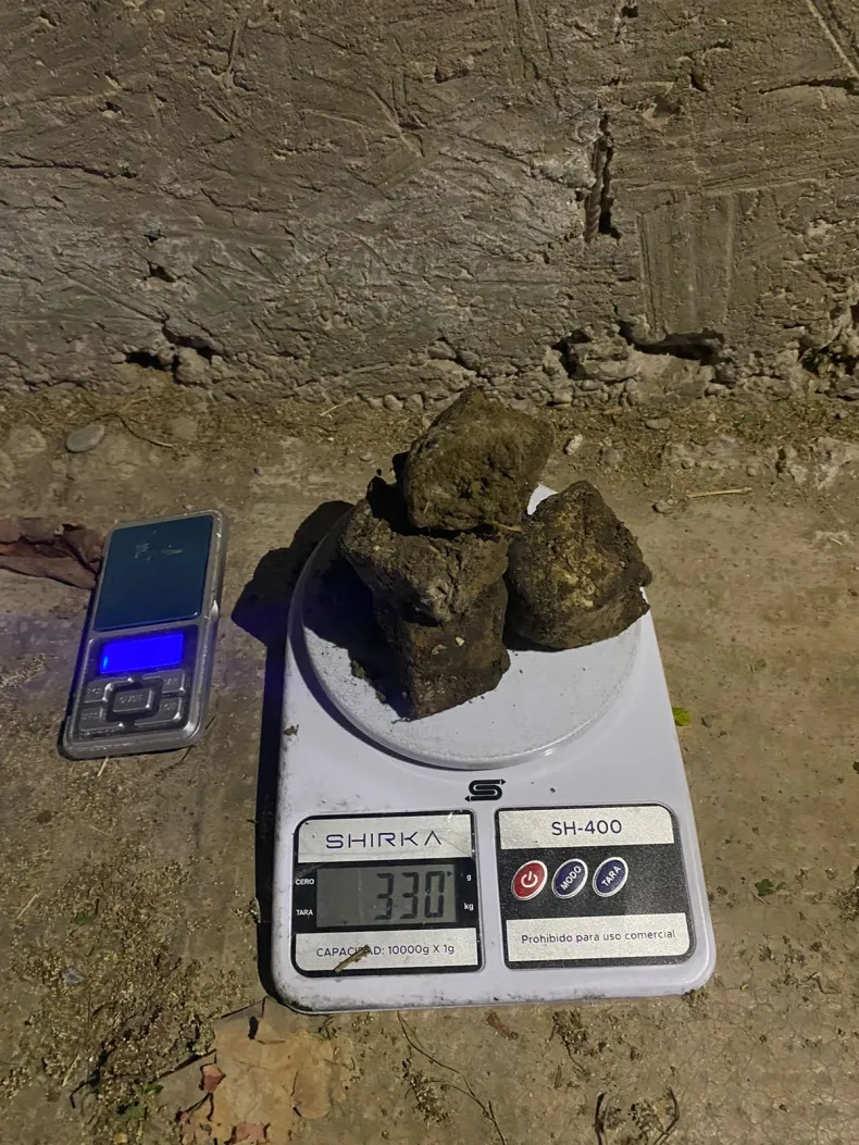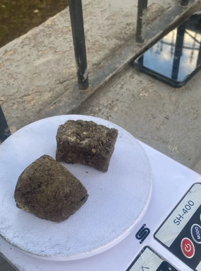 Al realizarle el palpado de rigor, los efectivos descubrieron que entre sus ropas llevaba algunas cosas ocultas. Al solicitarle que lo muestre, se determinó que se trataba de una balanza de precisión, y una importante cantidad de sustancia vegetal (marihuana), por lo que se realizó la correspondiente prueba de campo.