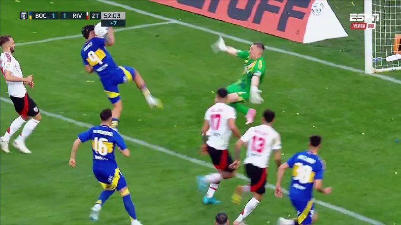 Lautaro Blanco metió un centro al área para Giménez, quien no pudo ser detenido por los defensores de River y marcó el empate en la Bombonera, pero, en el movimiento la pelota le golpeó en la mano y, posteriormente, en el rostro.