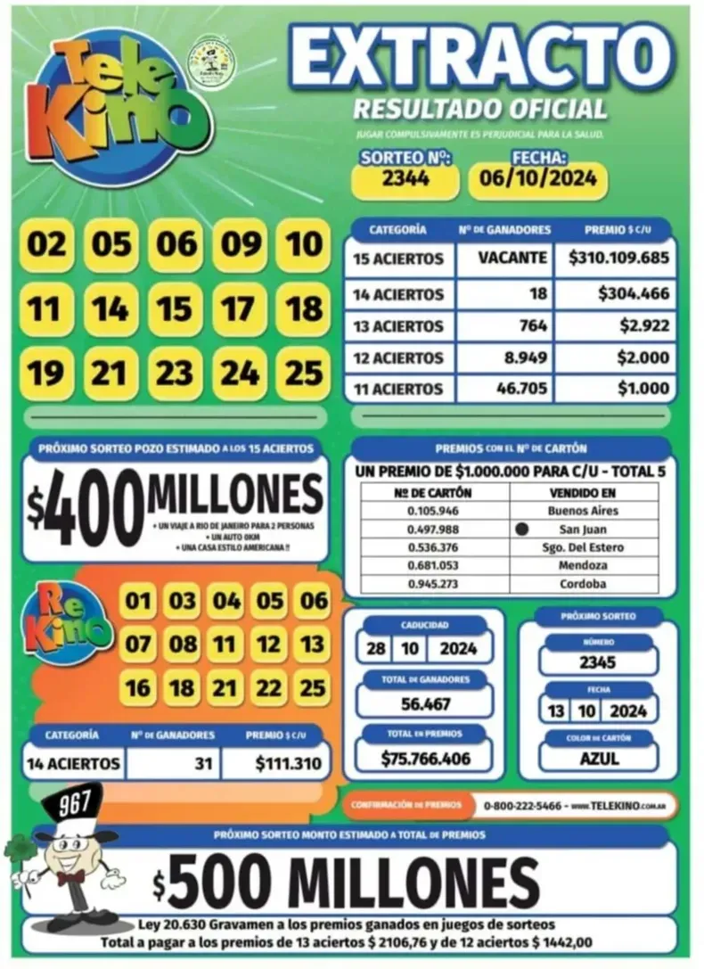 Por su parte, el premio mayor del Telekino quedó vacante y para el próximo domingo será de $400.000.000 y premios extras.