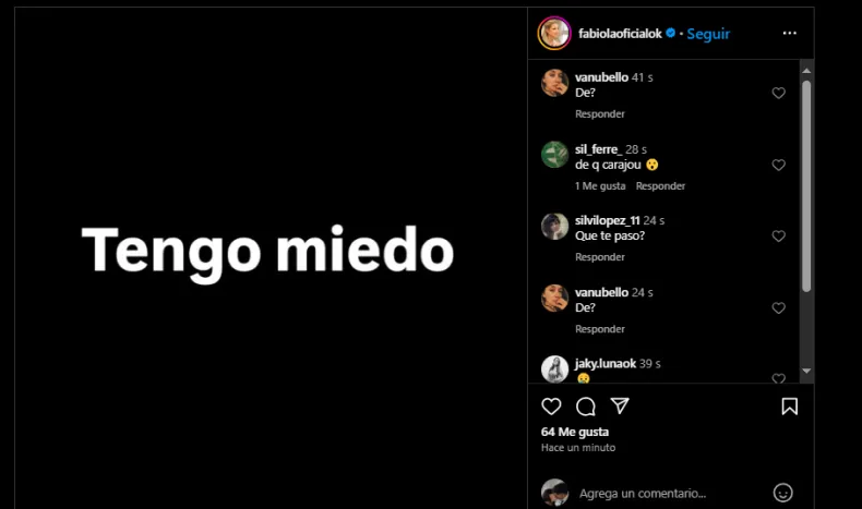 Durante la tarde de este martes, en su cuenta de instagram. Yáñez publicó la frase: "Tengo miedo", la misma se realizó en su perfil de Intagram y en el apartado de historias del mismo.