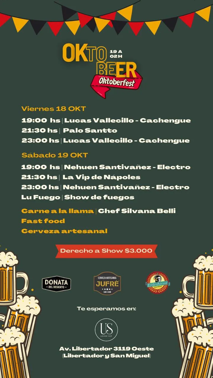 Este viernes 18 de octubre se realizará el Oktober Fest en Lounge Bar, ubicado en avenida Libertador al 3119 oeste, justo en la esquina de Libertador y San Miguel. Este evento será el viernes 18 y sábado 19 de 19 horas a 2 de la mañana.