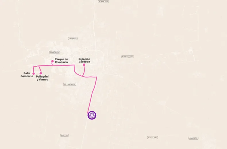 Línea Magenta (Oeste): Conectará con el Estadio a partir de salidas desde el Parque de Rivadavia, La Bebida (calle Comercio y Unión Vecinal del Barrio Conjunto V, y Pellegrini con calle Yornet) y la Estación Córdoba en Capital.