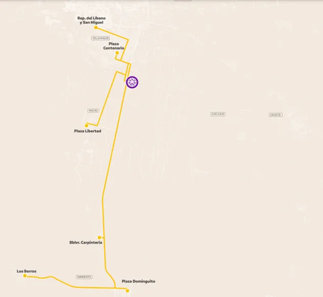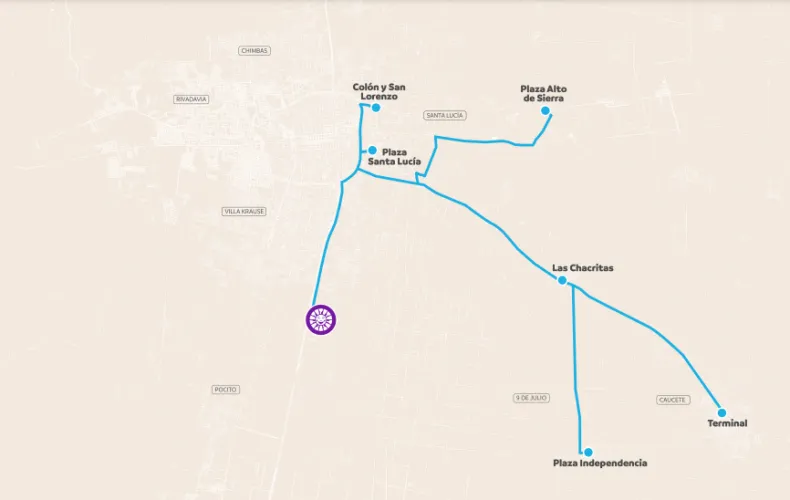 Línea Amarilla (Sur): Conectará desde Rawson (Plaza de Villa Krause y República del Líbano con San Miguel), Pocito (Plaza Libertad y Boulevard de Carpintería), y Sarmiento (Plaza de Media Agua y Plaza Los Berros).
