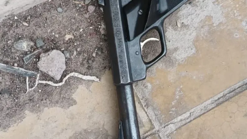 Luego de intensificar la búsqueda por la zona, lograron la detención del otro sujeto, que dijo llamarse Emanuel Díaz (36), Durante la requisa y búsqueda por la zona, se encontró en la vereda del local un arma de fuego, una pistola de color negro, que fue secuestrada por las autoridades.