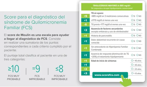 Es importante la información, y hoy existe un sitio web que incluye una herramienta diagnóstica --que ante la sospecha-- brinda el resultado de cuán probable resulta ser un paciente FCS: https://scorefcs.com/ El score de Moulin para el diagnóstico del Síndrome de Quilomicronemia Familiar es una escala que consiste en realizar una sumatoria de los puntos correspondientes a cada criterio cumplido por el paciente. Cuando el score es superior a 10 se considera de mayor certeza para el diagnósticos de FCS.