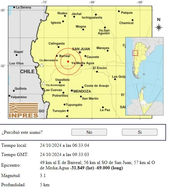 Un sismo de baja magnitud y a poca profundidad se registró en la mañana de este jueves 24 de octubre de 2024 en San Juan, según informó el Instituto Nacional de Prevención Sísmica (INPRES).