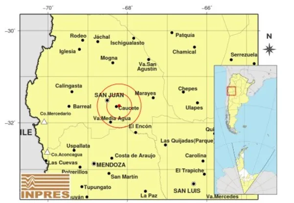 El Instituto Nacional de Prevención Sísmica (INPRES) reportó un sismo en la provincia de San Juan el domingo a las 21:56:55. El epicentro del movimiento telúrico se localizó en el departamento Caucete y a 32 kilómetros al este de la Ciudad de San Juan.