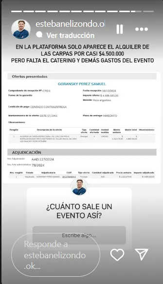 En su publicación, Elizondo adjuntó una captura de pantalla de la plataforma de transparencia de la UNSJ, donde figura el alquiler de carpas por $4.500.000. Sin embargo, sostuvo que no se incluían los costos de catering y otros gastos, dejando en el aire otra pregunta: "¿Cuánto sale un evento así?".