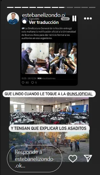 A través de sus redes, el joven asesor también celebró el inicio de una auditoría de la Sindicatura General de la Nación (Sigen) a la Universidad de Buenos Aires (UBA). "Qué lindo cuando le toque a la UNSJ", publicó Elizondo en su cuenta de Instagram, anticipando su postura sobre los controles a las universidades nacionales.