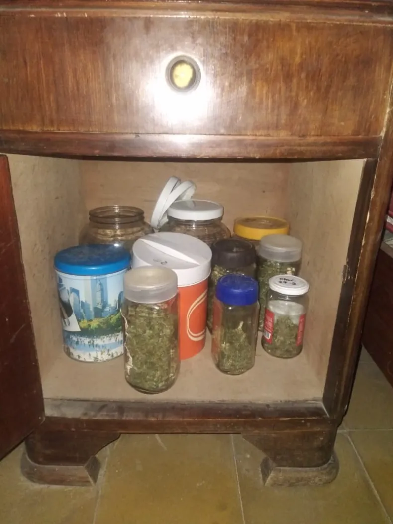 Como consecuencia del minucioso trabajo realizado en el lugar, los efectivos de la Policía Ecológica detecto la presencia de varios frascos ocultos en una mesa de luz, lo que parecía ser marihuana, por lo que le dio intervención al personal del Departamento Drogas Ilegales, quienes se encargaron de realizar la correspondiente prueba de campo, lo que determino de que efectivamente eran semillas, hojas y cogollos de esta sustancia.