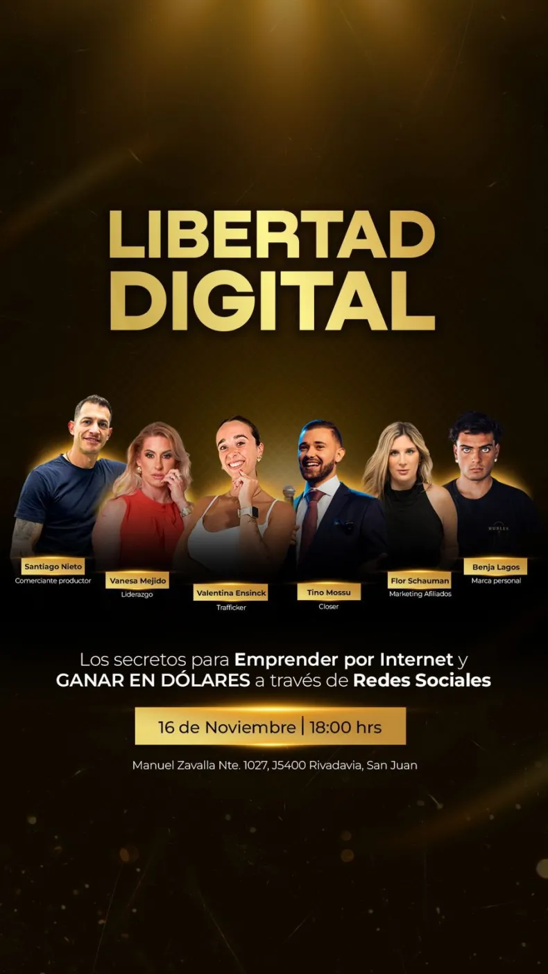 Por primera vez en San Juan, se realizará un evento único en su tipo orientado a aquellos interesados en emprender en el marketing digital. Bajo el nombre de "Libertad Digital," el encuentro está programado para el próximo 16 de noviembre a las 18 horas y reunirá a emprendedores, coaches, mentores, y expertos en marketing de toda Argentina. La sede será Finca La Cabaña, en Rivadavia.