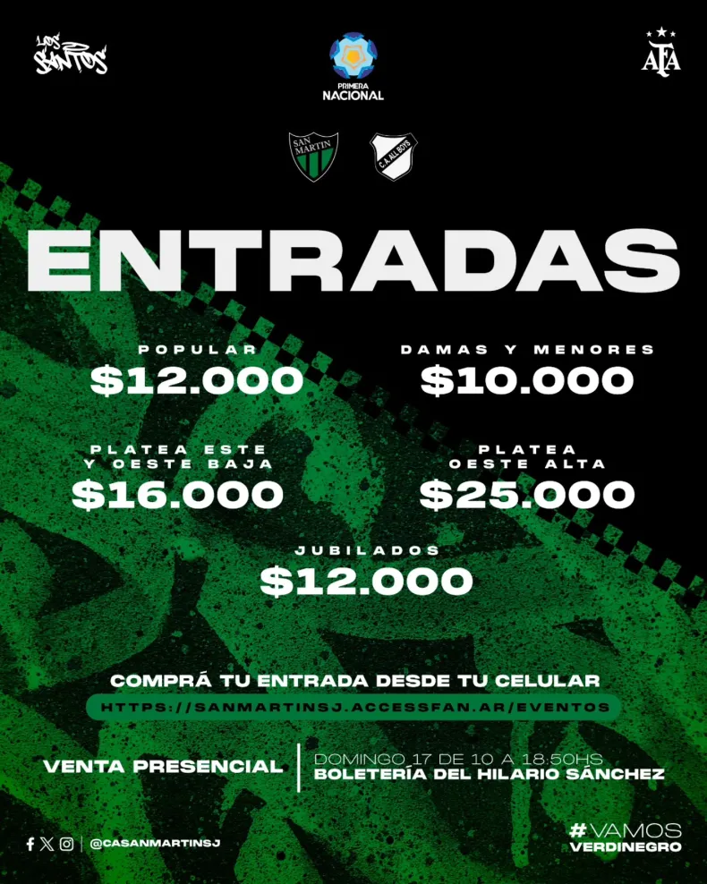 Las boleterias para la venta de entradas estarán habilitadas desde las 10.00 y hasta la hora del partido que es a las 18.50. Es necesario que se rebajó el costo en las popular ($12.000)y en las plateas ($16.000 y 25.000) para que vaya mas gente para apoyar al Verdinegro en esta patriada de llegar a la semifinal de la Primera Nacional.