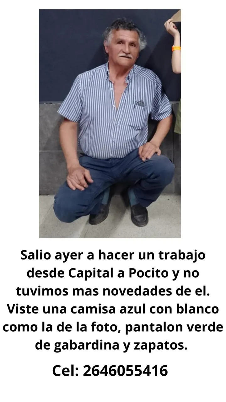Don Francisco tiene su casa en el Médano de Oro y salió bien temprano para llegar hasta la Legislatura para dejar su esposa, para luego dirigirse hacia una vivienda del Pocito, donde le habían solicitado un trabajo de cerrajería. Desde ese momento su paradero es incierto.