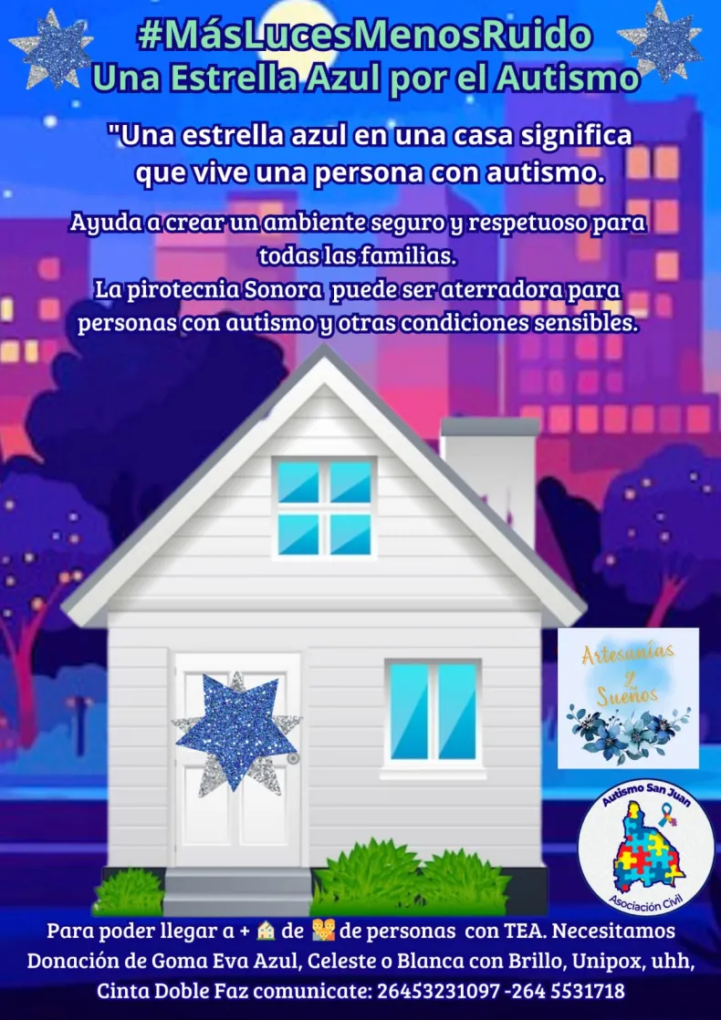 En la Asociación Autismo San Juan hay más de 530 familias que trabajan activamente para ayudarse entre sí en la convivencia y crianza de sus hijos con trastorno del espectro autista. En este sentido, la campaña la iniciaron con una organización de artesanos y solicitan a la población que los pueda ayudar con goma eva azul y plateada, y también con pegamento, para poder hacer estas estrellas.
