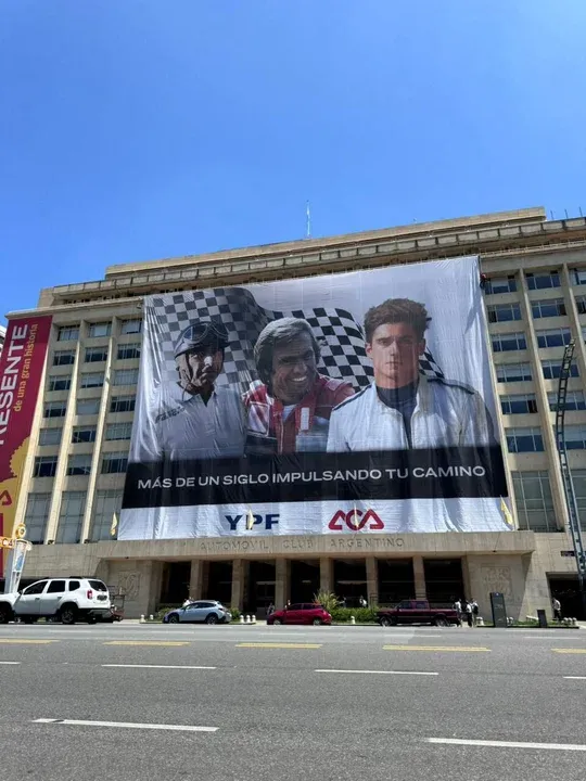 El Automóvil Club Argentino (ACA) celebra sus 120 años con una imponente gigantografía en donde aparecen Franco Colapinto junto a Juan Manuel Fangio y Carlos Reutemann. La imagen está ubicada en la sede central de la entidad, sobre Avenida Libertador, en el barrio porteño de Palermo